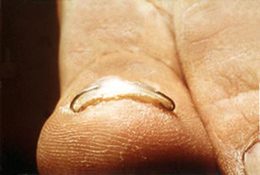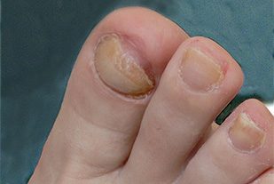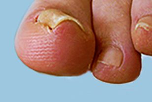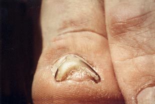 Ein derartiger eingerollter Nagel verur - sacht unter Umständen starke Schmerzen und sollte behandelt werden.